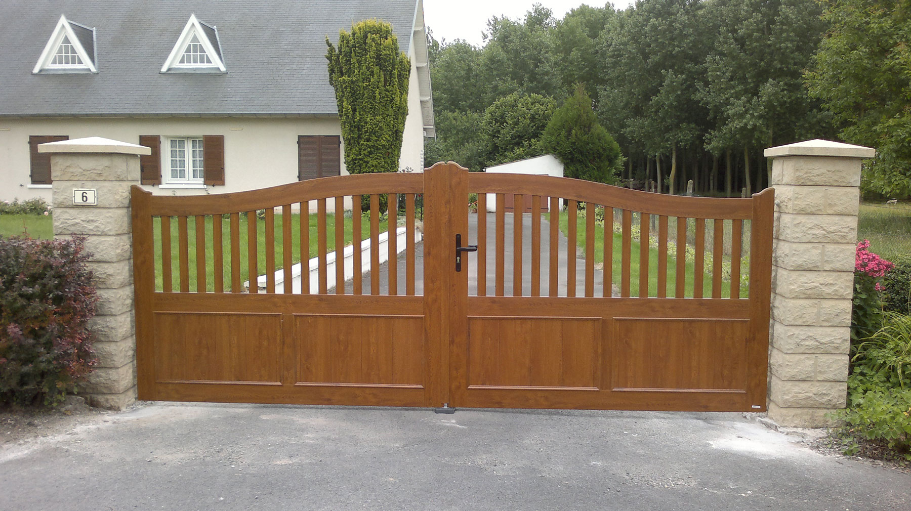 Dans le cadre d’une rénovation, nos équipes sont intervenues chez un client résident à Sydney, dans les Ardennes. Celui-ci souhaitait remplacer son portail, un peu vieillissant. Nous avons donc réalisé la pose d’un portail battant en PVC avec une ouverture manuelle dans un coloris chêne doré.